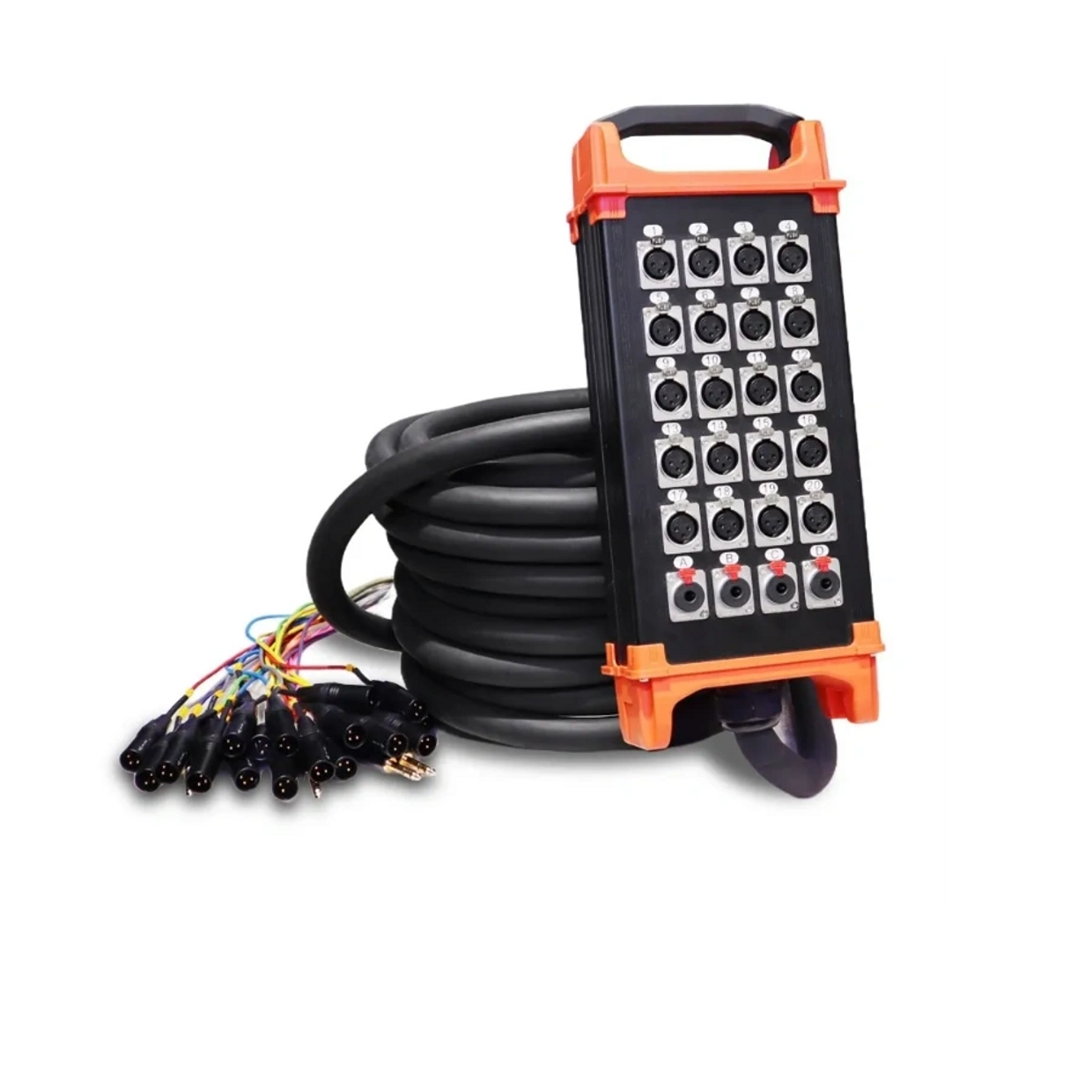 "Our professional stage boxes are built for reliable signal distribution in live sound, studio, and installation environments. Featuring high-quality XLR/TRS inputs and outputs, they are available in 4, 8, 12, 16, 24, and 32 channel configurations with cable lengths ranging from 10 to 50 meters. Designed for durability and clarity, these stage boxes ensure secure connections, reduced cable clutter, and efficient setup on stage or in the studio."